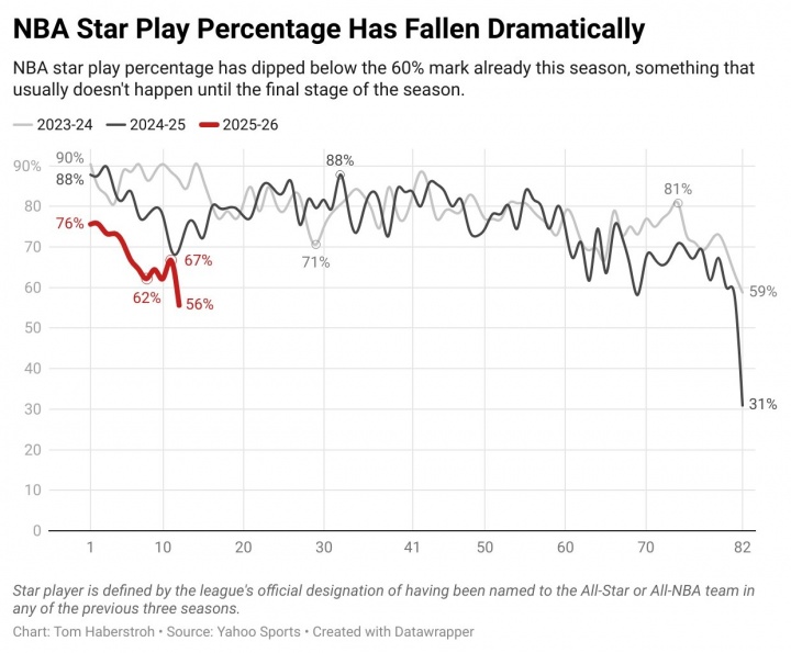 Theo thống kê và phân tích của phóng viên Tom Haberstroh, tính đến thời điểm hiện tại của mùa giải này, tỷ lệ tham dự của các ngôi sao đã giảm xuống dưới 60% và con số mới nhất là 56%. Ở những mùa giải trước, con số này thường chỉ xuất hiện vào cuối mùa giải. Đã không lâu kể từ khi mùa giải này bắt đầu. Hiện tượng này thật đáng lo ngại!