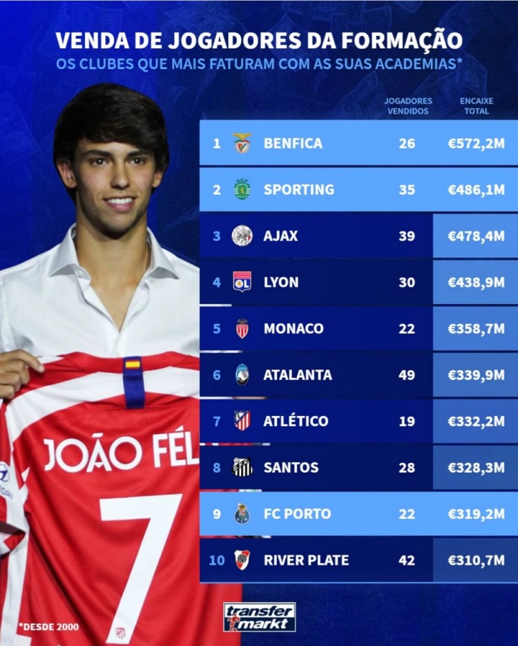 Thị trường chuyển nhượng Đức đã tổng hợp số liệu thống kê về thu nhập của nhiều câu lạc bộ khác nhau từ việc bán cầu thủ đào tạo trẻ trong thế kỷ này và lập một danh sách. Benfica, Sporting CP và top 3 Ajax.